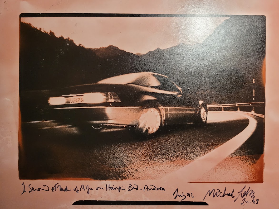 Alfa Romeo on a hairpin bend in Andorra, Pirelli shoot, one-off pink tone artist’s proof, by Michael Joseph