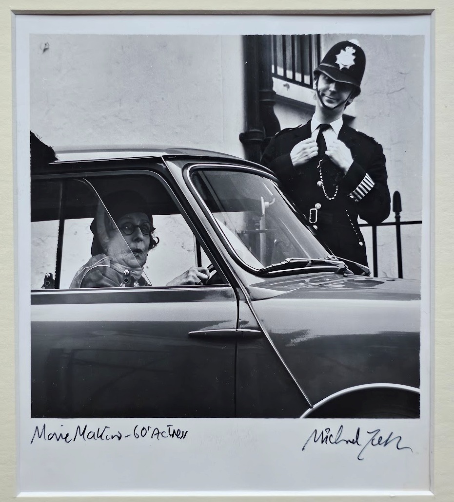 Dame agée au volant d’une Mini Cooper avec un gendarme à côté, photo prise à Londres par Michael Joseph