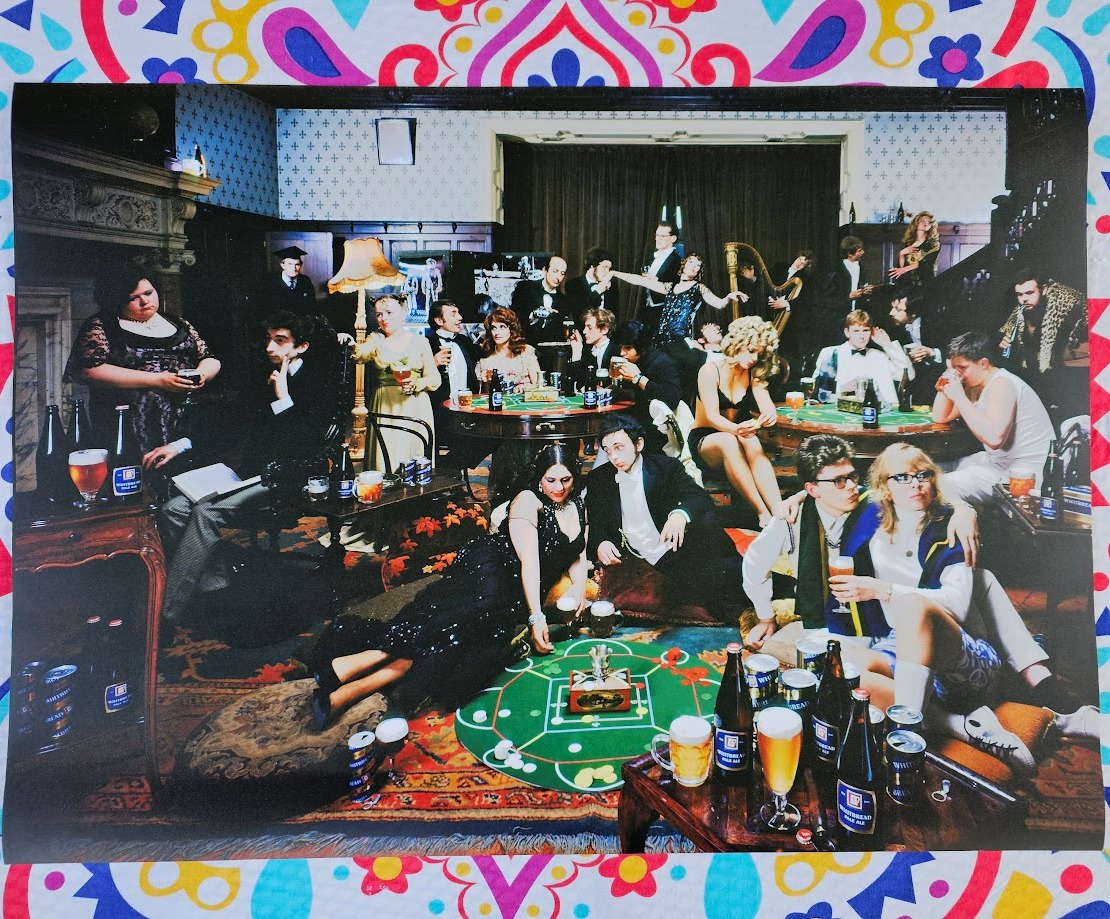 Publicité des années 70 mettant en scène un groupe de comédiens faisant semblant de passer un excellent moment en buvant de la bière Whitbread.