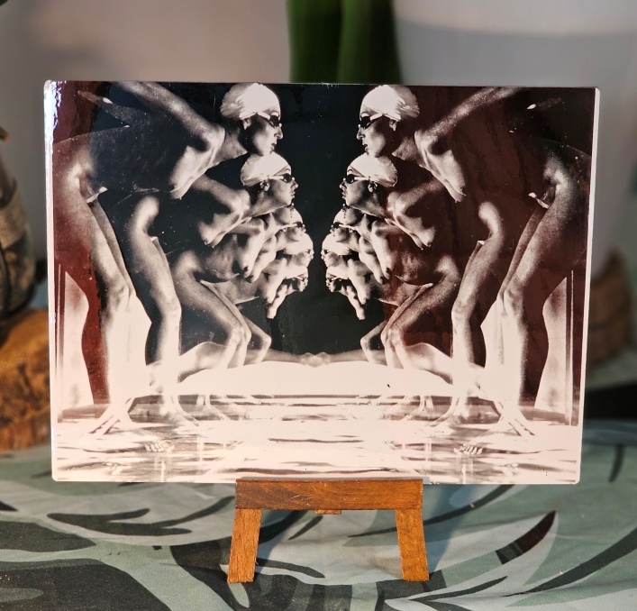 This striking image explores motion, symmetry, and reflection through a layered composition of divers captured at the moment of transition between stillness and movement. Rendered in cool blue tones, the figures appear multiplied and mirrored, creating a dreamlike rhythm that blurs the boundary between body and water. The interplay of light and grain enhances the sense of fluidity, transforming a fleeting athletic gesture into a poetic meditation on balance, repetition, and choice—diving forward or back, into action or reflection.