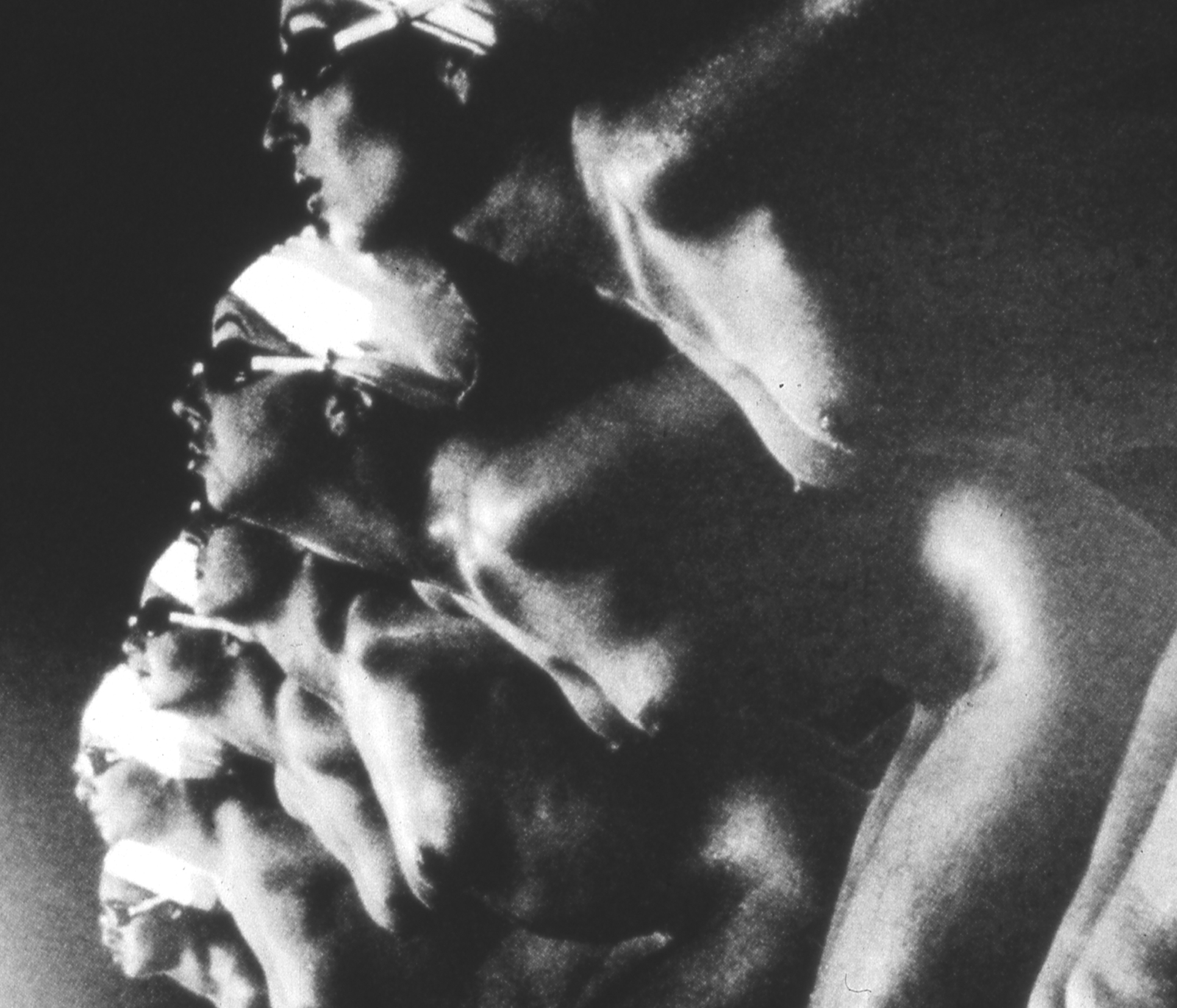D’autres images poétiques issues de cette série incluent Nager dans des directions opposées, Nageuse solitaire et Prêtes à plonger. On y trouve également quelques portraits plus calmes de femmes au repos — moins mis en scène, mais tout aussi saisissants, tirés en chambre noire par l’artiste lui-même.