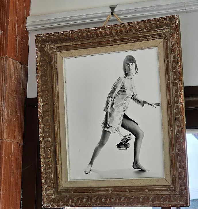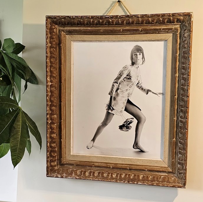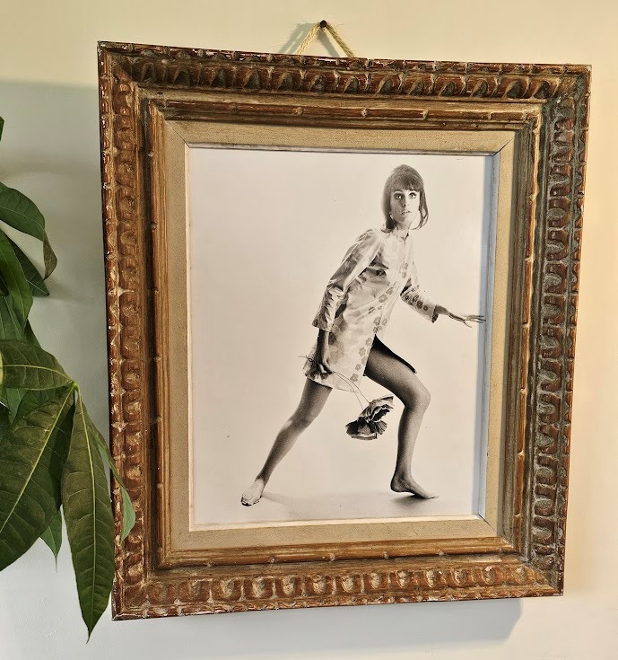 Now, onto our groovy upcycled timber picture frame, featuring a whimsical model strolling barefoot in the studio, channeling those iconic vibes of the swinging sixties!