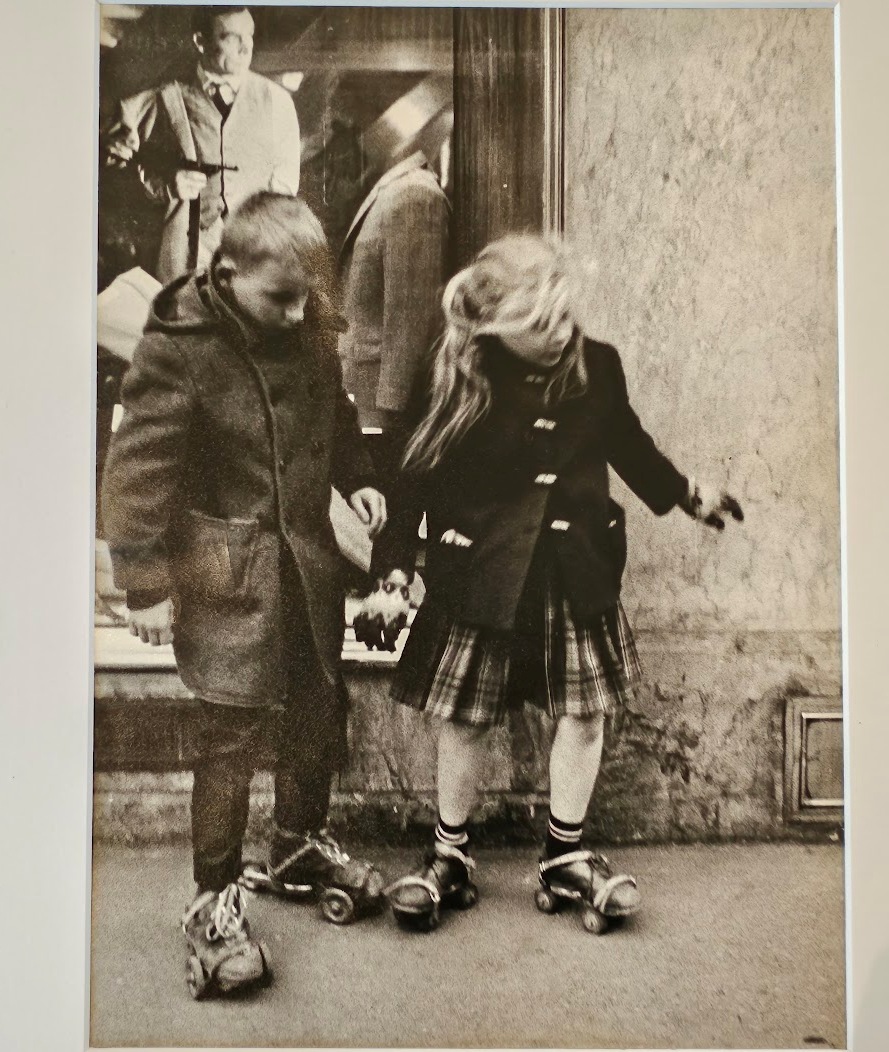 Kids unsteady on skates in parisian street with tonton flingueur in shop window behind by Michael Joseph