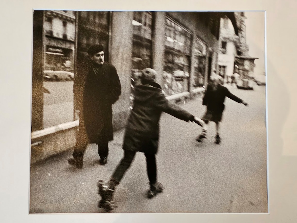 Pair of kids skating in parisian street with an onlooker in a beret by Michael Joseph