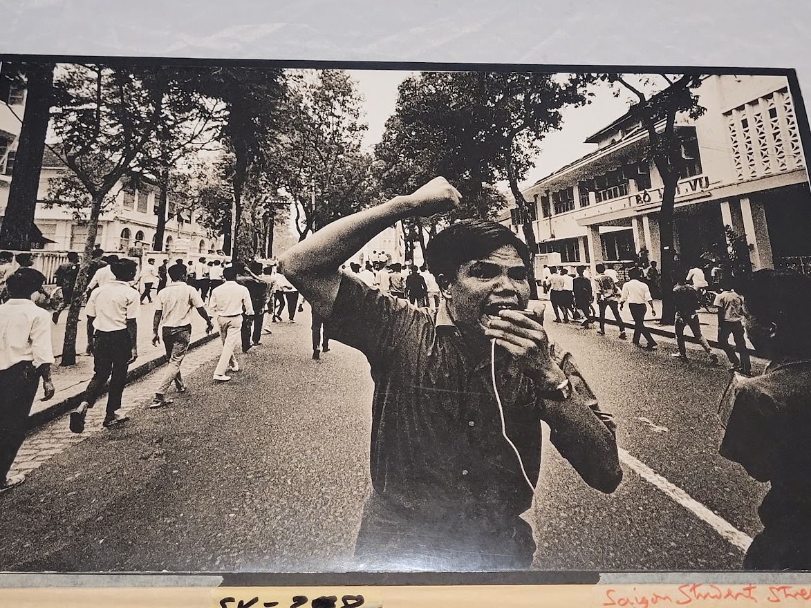 Print created by the photographer in his darkroom of a group of students during a rally in South Vietnam. Michael was assigned to Vietnam when he was barely 22 years old to take photographs of the Vietnam war with Brian Moynahan a journalist friend. Several of his photos appeared in british newspapers like the Guardian.