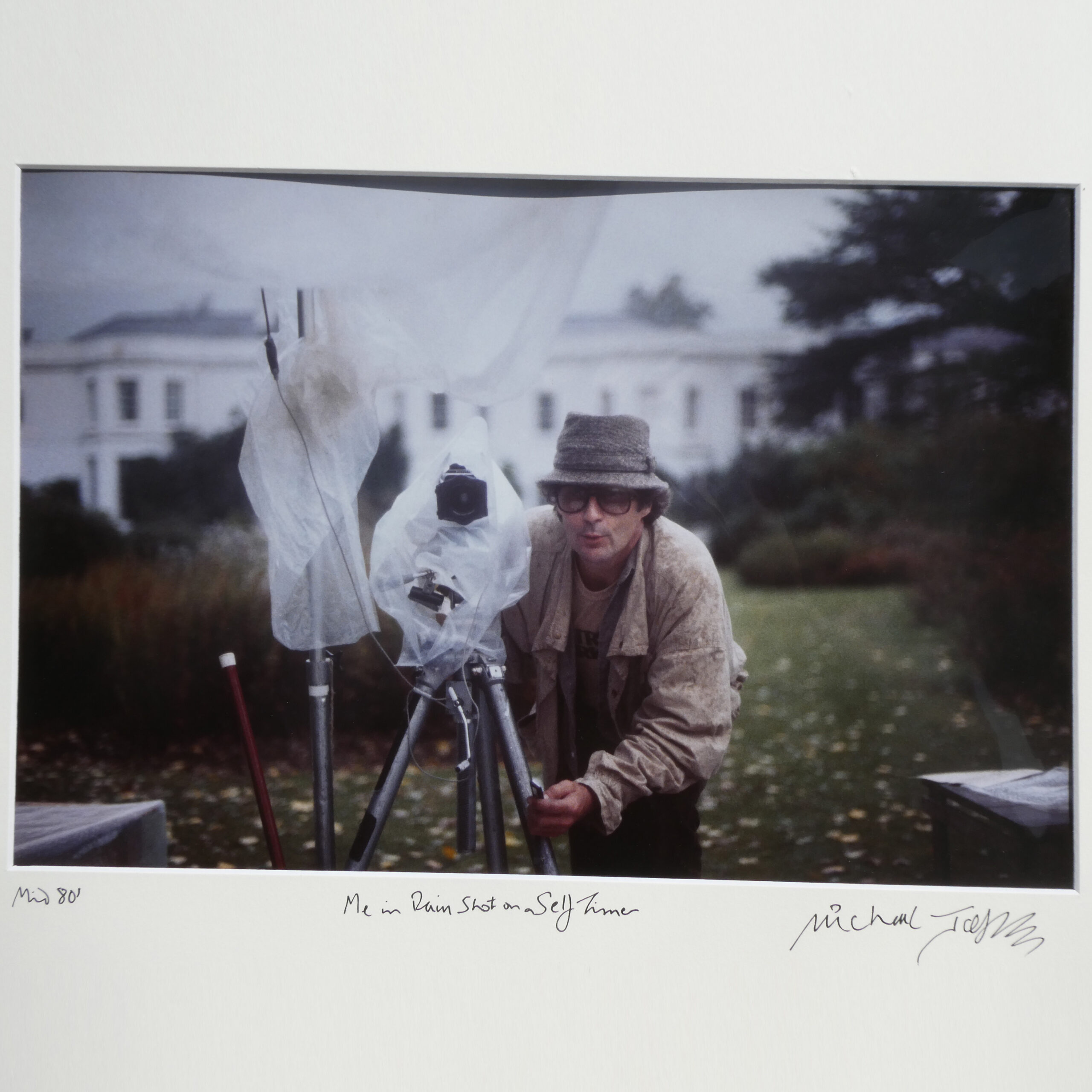 The photographer on a photo-shoot in the rain with a self-timer, castle-type building behind by Michael Joseph