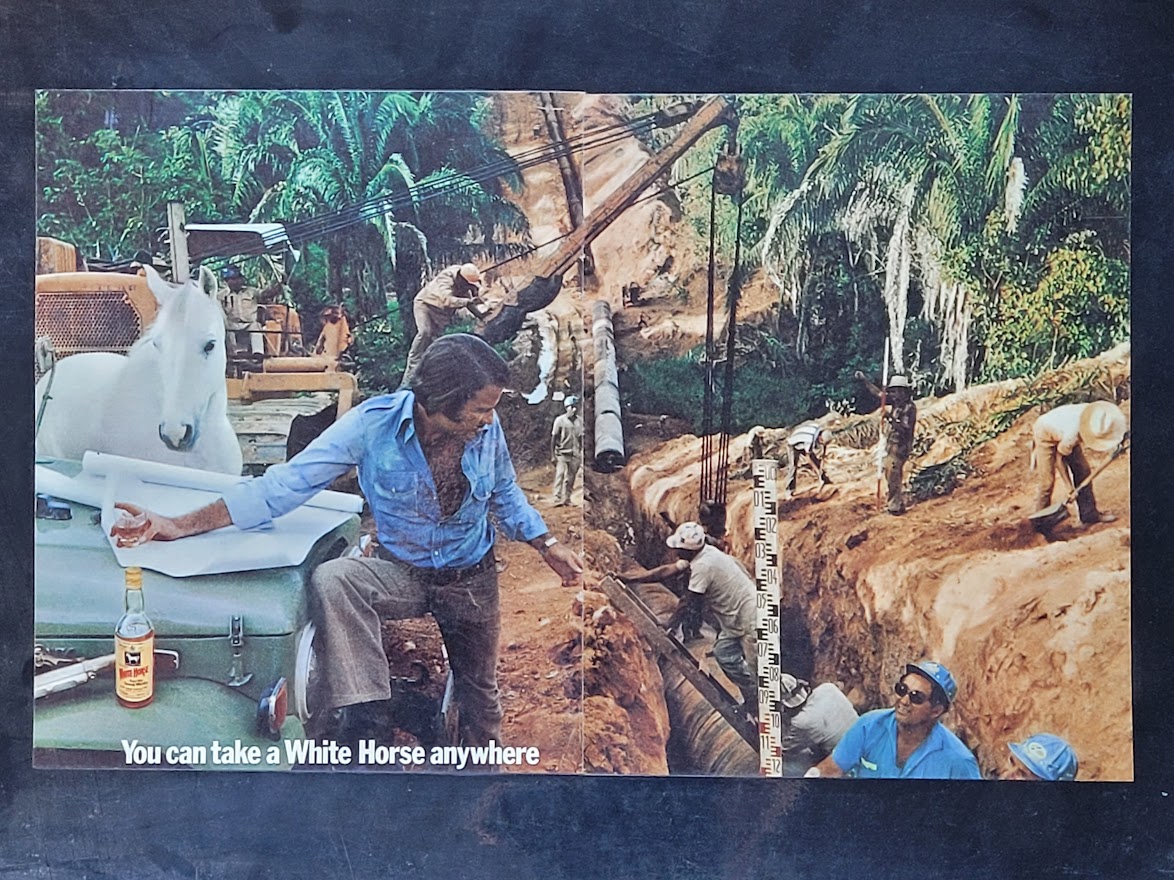 White Horse Whisky Excavation you can take a white horse anywhere Laminated advert (by Michael Joseph)