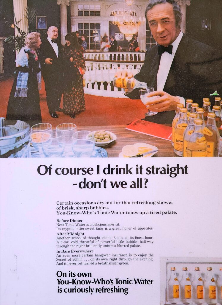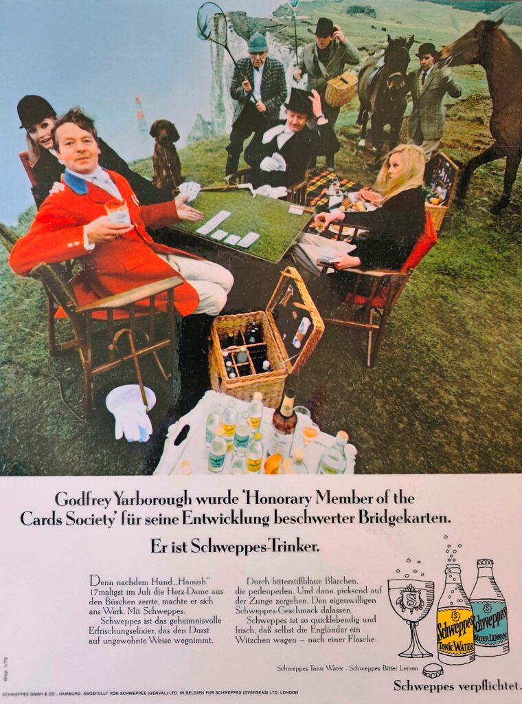 Here, a very well-known actor in the United Kingdom, William Franklyn, presents Schweppes as if it were the most normal drink on every occasion.