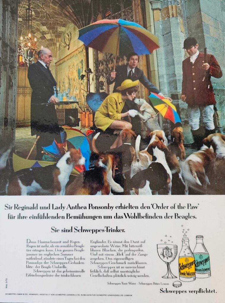 Since hare hunting and rain are harder for sensitive beagles to bear than for anyone else, the Ponsonbys, moved by compassion during an English summer downpour, invented the Beagle Umbrella — a stroke of genius inspired by Schweppes.